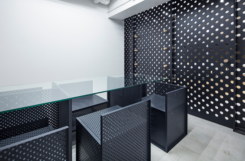 辦公室細節設計中使用的穿孔材料是公司自身產品制成的。這些穿孔,也用于E&Y生產的家具,在空間尺度上表達了企業的身份。該材料還用于傳輸空氣和光,減輕了行政室和會議室的限制條件。這些孔足夠大,可以插入用作門把手和擱板定位銷的木棍。員工可以在任何方便的位置輕松安排貨架。