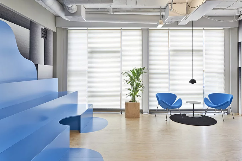 另外辦公室裝修中定制的印花地毯,固定在墻上的矩形漸變,反映了設計師對當代城市景觀天際線的詮釋。辦公室裝修所定制家具與現有家具相結合,營造出私密的空間,強調彩色雕塑與天然植物的有機結合。