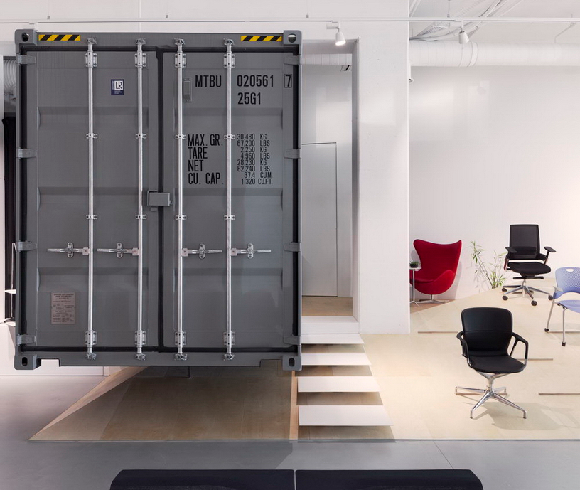 辦公室裝修中這兩個(gè)集裝箱劃分了展廳的功能區(qū)域,同時(shí)用于展示區(qū)域。為了活躍空間,保加利亞設(shè)計(jì)工作室DA建筑師將其中一半的容器切成一半,位于展廳的不同區(qū)域,另一個(gè)容器在空氣中升起,蓋在椅子展示膠合板的講臺(tái)上。辦公室裝修其中一個(gè)長(zhǎng)長(zhǎng)的側(cè)壁被拆除,為酒吧和娛樂場(chǎng)所創(chuàng)造空間。